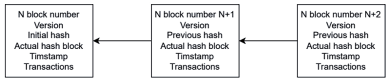 In January 2009, Bitcoin was created, attributed to the pseudonym Satoshi Nakamoto; his ideas were disseminated via article [36]; describing ideas that underpin the blockchain. Blockchain can be conceptualized as a data structure that only receives data (not allowing deletion or alteration) with the addition of a timestamp, storing this data in a chained and sequential way in a distributed point-to-point network [37]. This read-only guarding technology for chained data allows trust, verification, credibility, and transparency [38]; in addition to the ubiquity characteristic that distributed networks provide. These blocks are structured to contain a time mark (timestamp) and a hash code that assists in pointing to the other previous blocks. Then reinforcing the immutability of the blockchain [39]. Blockchain are often used in logistics projects [40, 41]; contributing to the recording of the movement of assets among the actors. A brief representation of a block structure with pointers to the previous blocks can be seen in Figure 3.