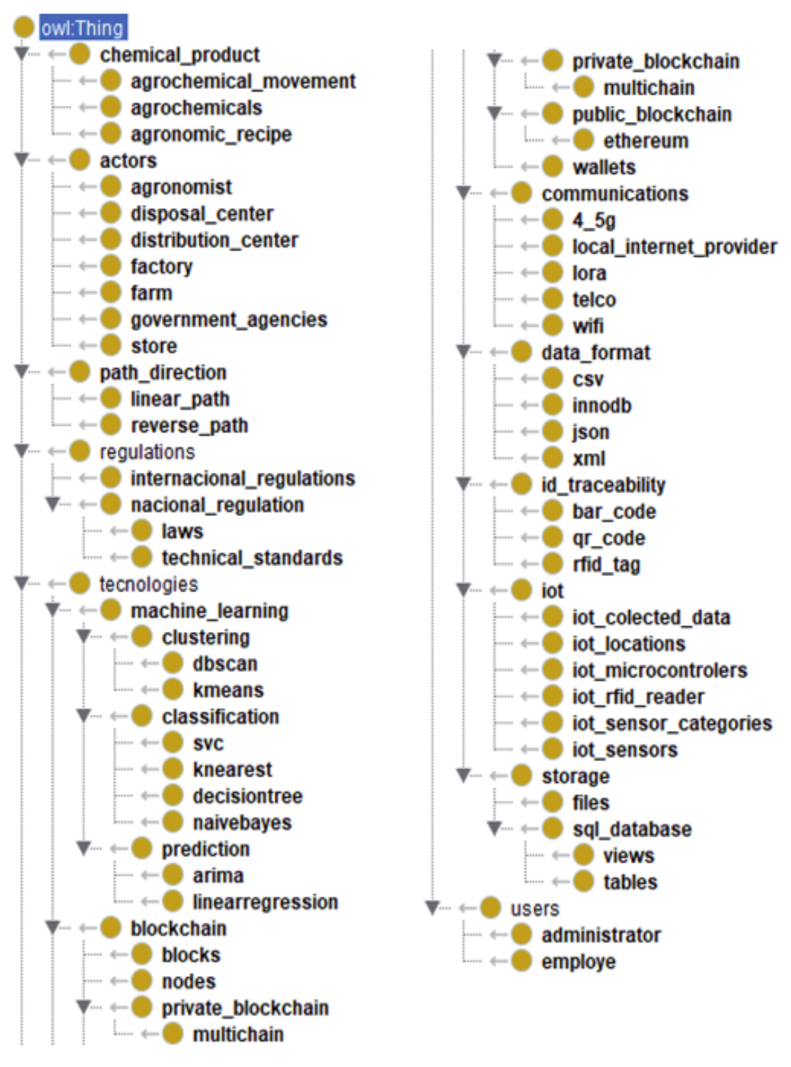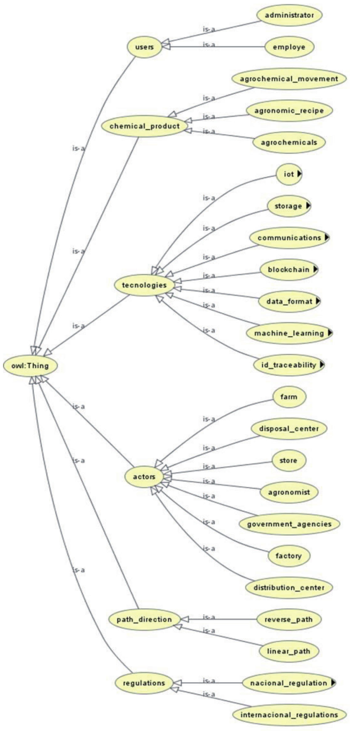 This proposed ontology is called ontology for pervasive traceability of agrochemicals (OntoPTA). The main classes that are presented in this ontology can be seen in Figure 5. The same hierarchical representation can be seen as a graph by using the plugin in OWLViz3 in Figure 6. From the Thing class we have: actors, path_direction, users, chemical_product, regulation, technologies.