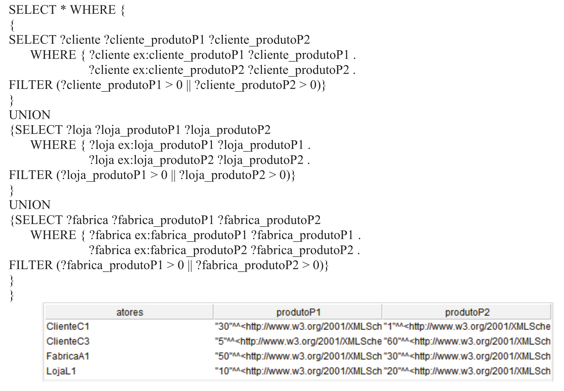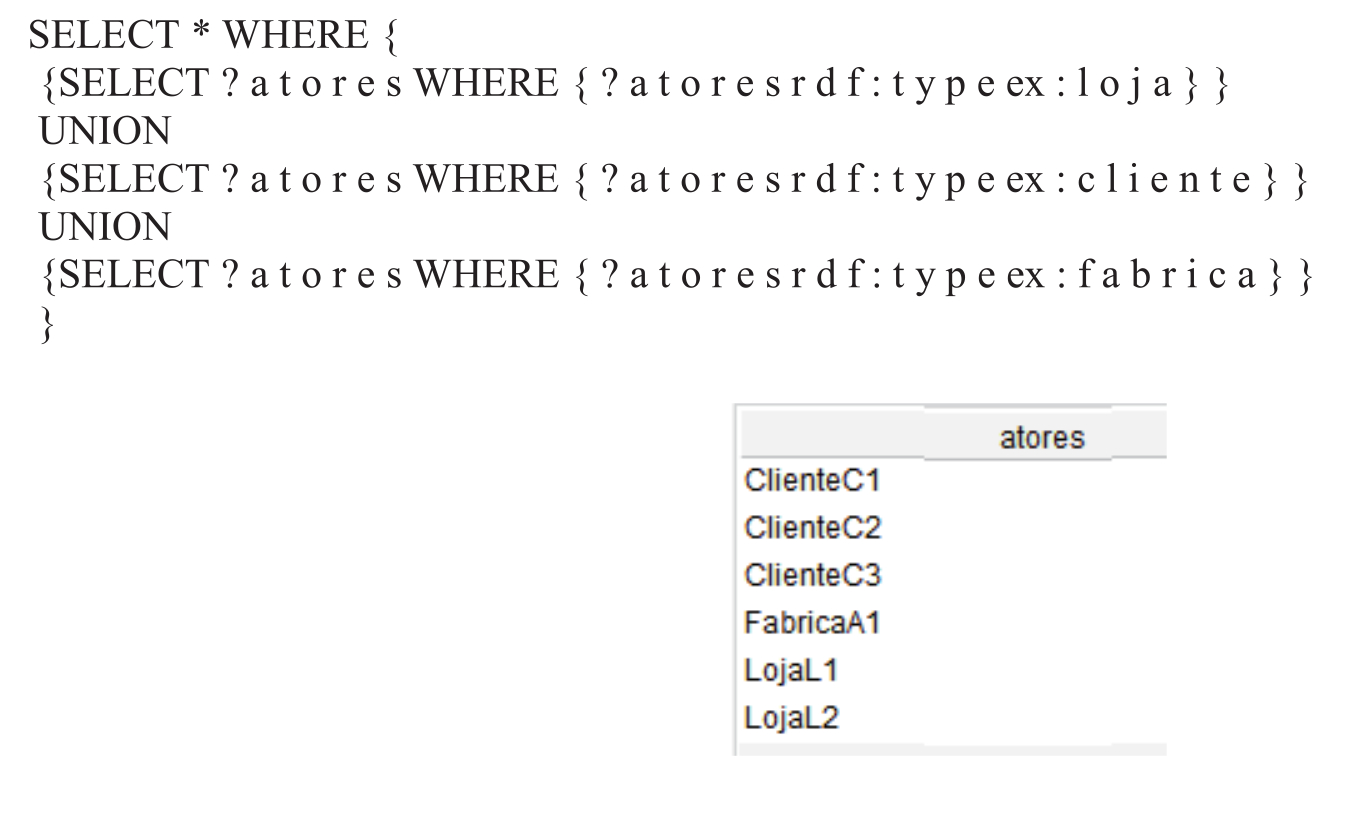 Queries were also performed via Protégé. In addition to classes, attributes and properties, some data were inserted so that the model could be tested via SPARQL4 queries. For example, to verify who are the actors involved in the supply chain, the following query was executed and its respective result in Figure 8 and Figure 9.