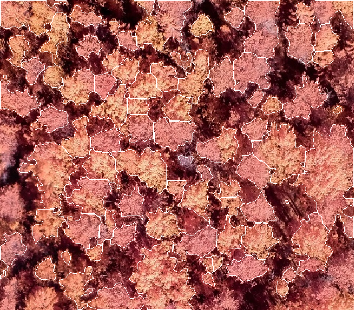 Использование стандартного метода сегментации водораздела не позволяет точно выделять кроны деревьев на снимке БПЛА. В зависимости от настраиваемых параметров результат будет либо обобщённым (многие кроны будут объединены в группу и будут считаться за одно дерево), либо чрезмерно раздробленным (из-за внутренних теней крона одного дерева будет считаться за несколько, а маленькие кроны деревьев не будут обнаружены). Поэтому задача решается в два этапа: определение контуров общей области крон деревьев и разбиение этих областей на контуры единичных деревьев.