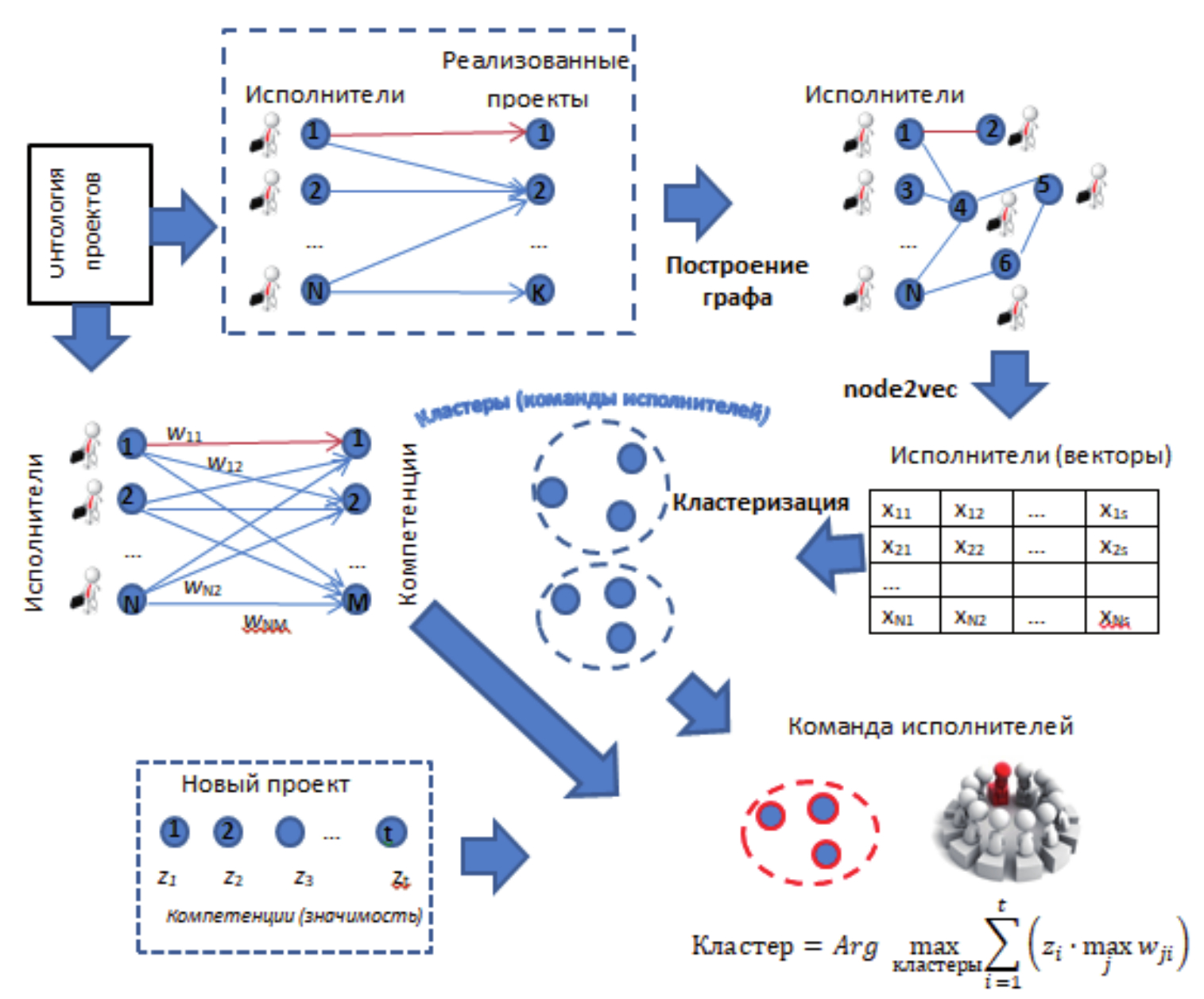 Для применения алгоритмов получения векторных представлений для простых графов с однородными вершинами и однотипными отношениями необходимо сначала построить такой граф на основе онтологии. Общая схема построения графа и выбора проектной группы представлена на рисунке 3. Первым этапом является формирование неориентированного графа, вершинам которого соответствуют исполнители, а наличие связи между исполнителями означает их участие в одном и/или схожем уже реализованном проекте. Далее необходимо применить один из алгоритмов построения векторных представлений вершин простого графа. Полученные векторные представления потенциальных исполнителей затем могут быть использованы для формирования групп (кластеров) исполнителей c помощью известных алгоритмов кластеризации [16]. Далее осуществляется выбор кластера, исполнители в котором обладают всеми требуемыми компетенциями на достаточном уровне, для этого используются оценки компетенций исполнителей, а также их значимость (на рисунке 3: wij – оценка j-й компетенции i-го исполнителя, zj – значимость j-й компетенции для проекта; ).