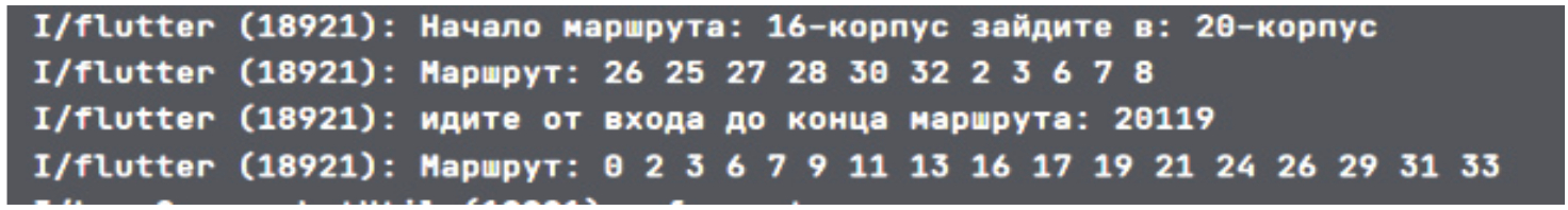 На рисунке 3 показан пример шаблона данных МП, принимающего входные данные и отображающего возможные маршруты внутри помещения, с нумерацией аудиторий. Для разработки программного обеспечения выполнена предварительная работа на базе предоставленных ОГУ документов о планировке корпусов и актуальной информации о расположении аудиторий и иных помещений. Подготовленный материал форматирован к виду, соответствующему шаблону данных. Полученный результат помещён в БД, которая размещена на удалённом сервере. В интерфейсе поля, отвечающего за выбор начальной и конечной точек маршрута, происходит наполнение информацией из БД, т.е. из полей легенды карты при старте программы. Когда пользователь совершает выбор, то данные записываются во вре́менные переменные, описанные в логической архитектуре, представляющей собой объектно-ориентированную программы, которая содержит слои, классы объектов, пакеты, основные платформы, интерфейсы, подсистемы и их взаимодействия.