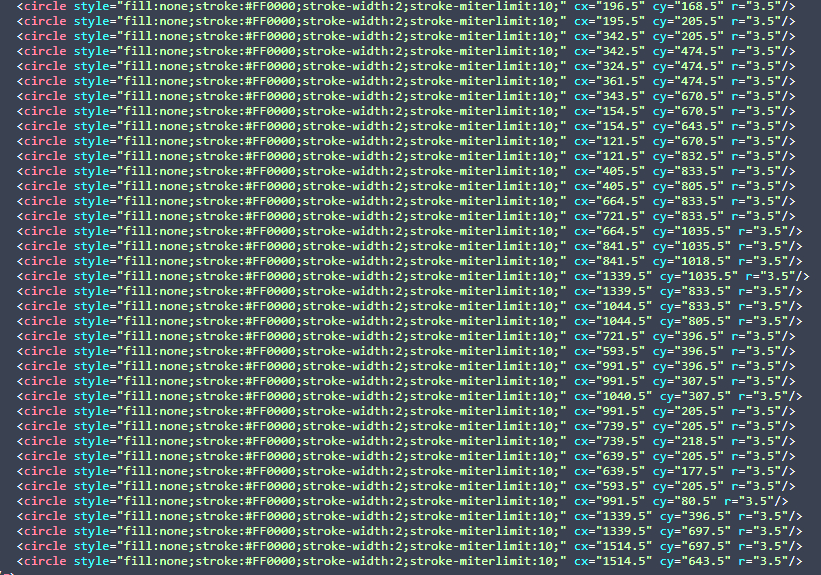 На рисунке 9 приведена структура SVG-изображения, полученная за счёт обработки данных о планировке помещений и актуальной информации. На основании слоёв 3 и 4 за счёт работы скрипта PHP генерируется таблица смежности графа, приведённая на рисунке 10. На вход подаются данные, представленные на рисунке 9, вычисляются растояния между точками, на основании бинарных отношений принадлежности точек прямым и пересечений прямых определяются ближашие соседи для всех вершин (рассматривает маршруты, проходящие через окружности из слоя 4 и отыскиваются ближайшие окружности, через которые проходят эти дороги).