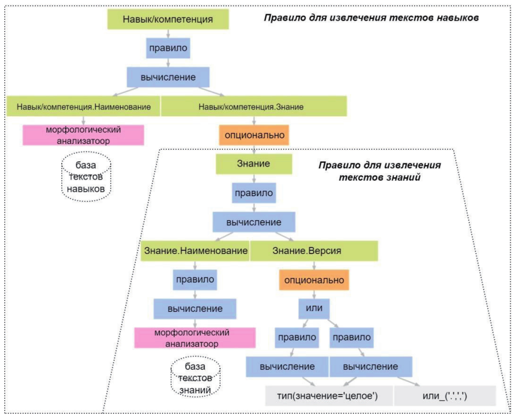 Были подготовлены правила извлечения текстов знаний и навыков/компетенций. Правило для определения знаний может быть самостоятельных правилом и опциональным элементом, встраиваемым в правило определения навыков/компетенций. Структура правил для извлечения навыков/компетенций представлена на рисунке 4.
