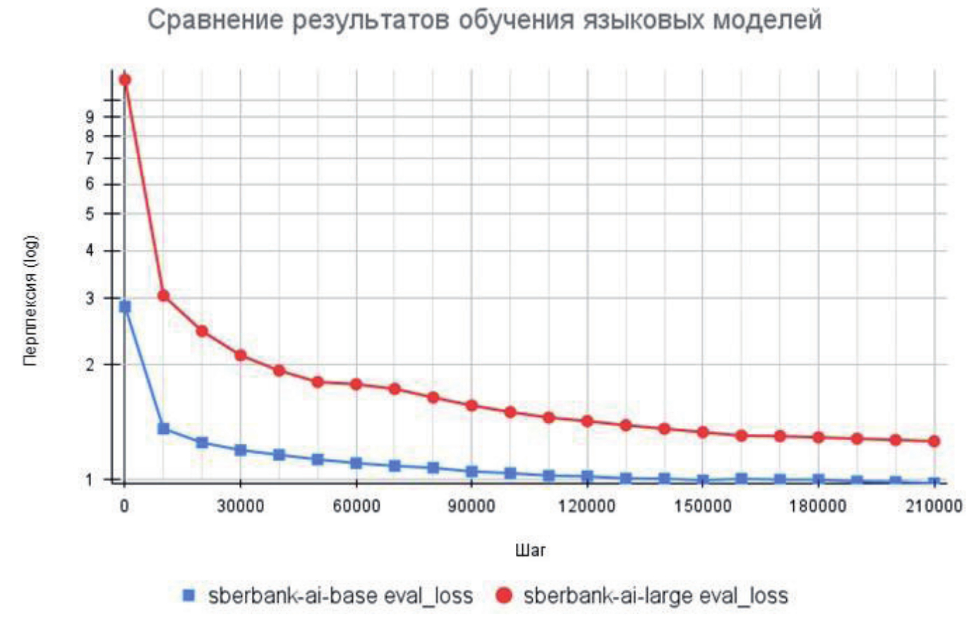 Дообучение моделей производилось по методу MLM в течение пяти эпох (1 эпоха – 30000 шагов, см. рисунок 5). Далее процесс дообучения моделей был расширен до 7 эпох (шаги 150000-210000 на рисунке 5), но это не привело к существенному улучшению показателя перплексии.