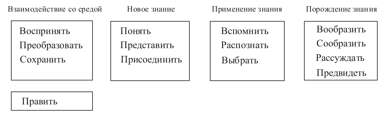 В левую часть рисунка вошли акты мышления, отражающие взаимодействие мозга с внешней средой. Первые три действия относятся к органам чувств и не обязательно связаны с мозгом. С точки зрения обработки информации названные функции соответствуют подготовке данных для обработки, т.е. являются предварительной ступенью познания. Действие править использует результаты обработки информации для воздействия на внешнюю или внутреннюю (управление организмом) среду, т.е. то, что в технике называется управлением.