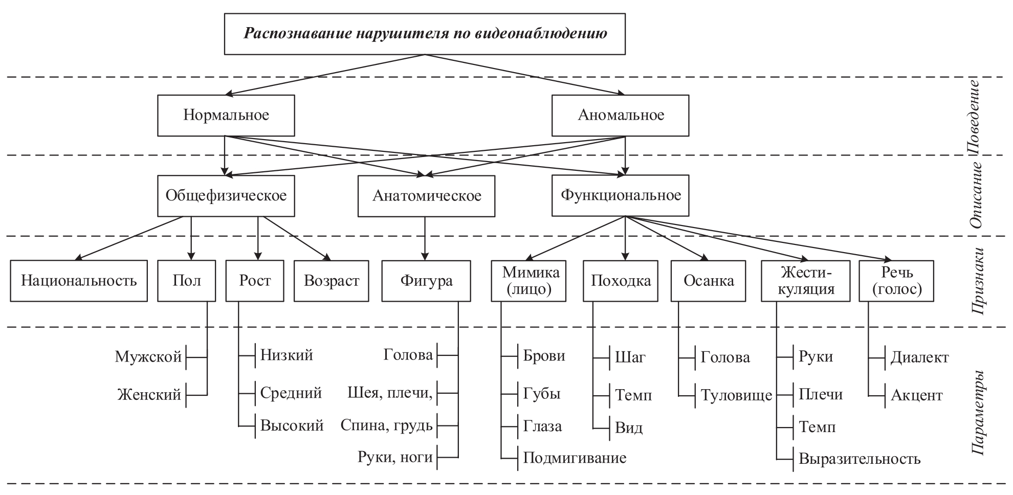 Описание внешности человека. Общефизическое описание – элементы внешности; анатомическое – описание всей фигуры в целом либо отдельных областей тела; функциональное – особенности, которые проявляются в движении. Каждый из анатомических признаков характеризуется по форме, размеру, положению, цвету [29]. При этом некоторые параметры могут быть представлены в виде словесного (нечёткого) описания, например, телосложение – слабое, очень слабое, среднее, коренастое, атлетическое; упитанность человека – худой, худощавый, средней упитанности, полный. Функциональное описание: мимика – движение мышц и элементов лица, которые могут меняться в зависимости от эмоционального состояния человека; походка – совокупность индивидуальных телодвижений при ходьбе; жестикуляция – комплекс движений рук, плеч, головы человека, которыми он сопровождает свою речь; речь – данные речевого механизма.