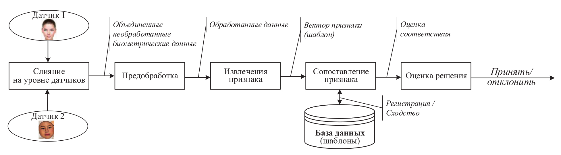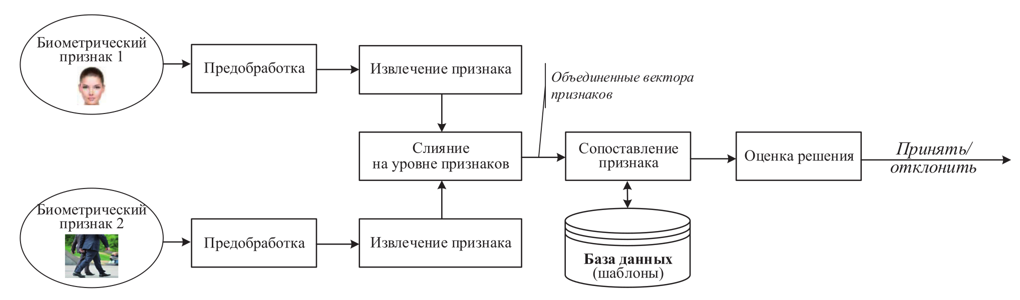 Согласно категории до сопоставления признаков слияние осуществляется на уровне датчиков, на уровне признаков до того, как будет выполнено сопоставление биометрических данных [37, 38, 40-43].