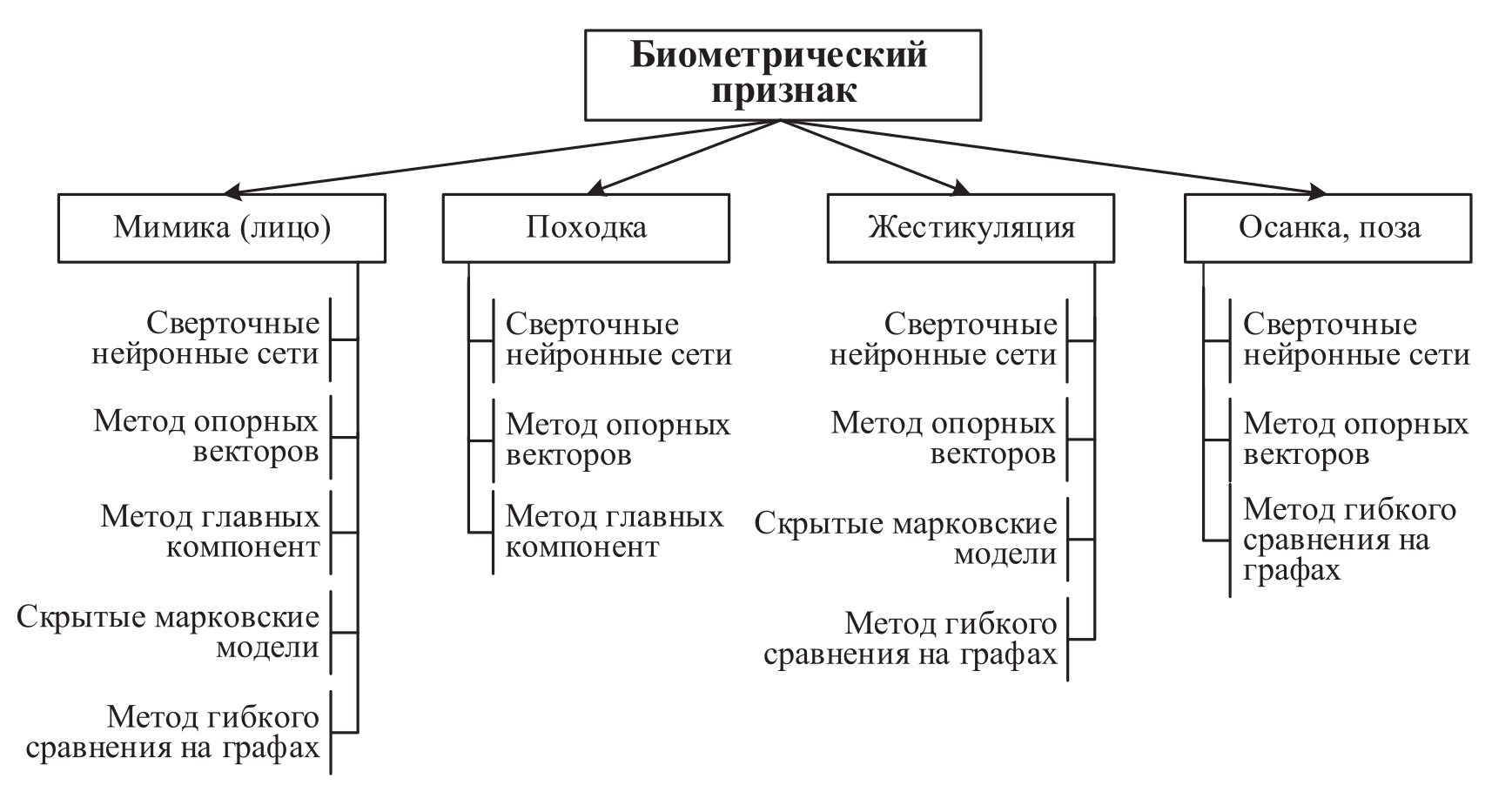 Рисунок 12 – Классификация методов и технологий распознавания человека по движению тела и лицу