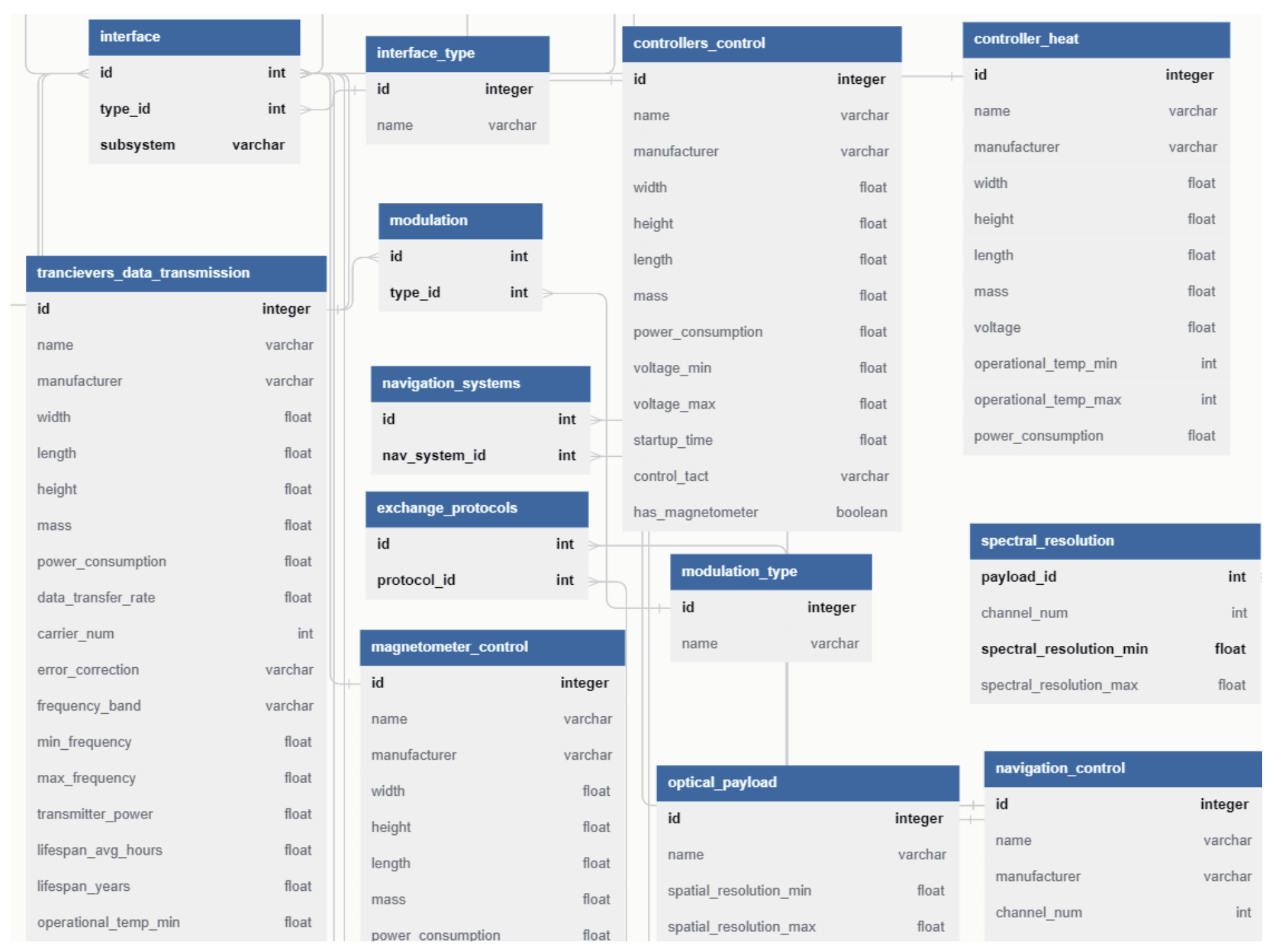 При выборе параметров для описания каждого из типов подсистем МКА в качестве основы использовался приведённый выше перечень требований из [22]. Информация для БД собиралась из каталогов продукции предприятий, выпускающих оборудование для изделий космической техники [23-27].