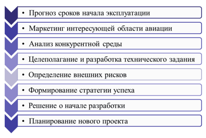 Цель этапа – оценить потребность в новом проекте и обосновать ТЗ на его осуществление. Источником знаний на этапе являются результаты различных исследований, которые выполняются специальными методами, объединёнными в согласованную систему или единый план получения знаний, необходимых для обоснования и инициации проекта самолёта (см. рисунок 2). При создании нового летательного аппарата (ЛА) требуется кооперация множества предприятий и продолжительное время разработки до момента освоения его в эксплуатации (см. рисунок 3).