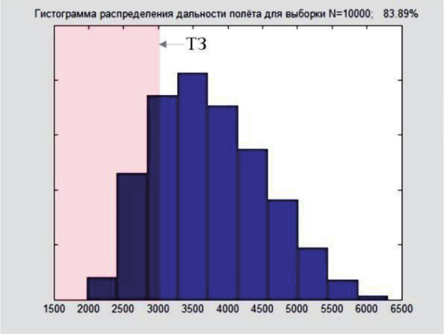 Согласно методологии (рисунок 14) в первую очередь формируются модели неопределённости основных характеристик объекта, от которых непосредственно зависит его целевая функция. Например, расход топлива, аэродинамические и массовые характеристики самолёта в связи с дальностью его полёта. Их значения на начальных этапах проекта не могут быть определены точно. Поэтому по статистике или экспертно необходимо оценить распределение их вероятных величин в возможном диапазоне значений. На этой основе выполняется имитационное моделирование с объединением случайных величин в составе интегрального показателя, например, методом Монте-Карло. Полученную гистограмму распределения вероятных значений интегрального показателя сравнивают с требованиями к самолёту (рисунок 15). Результатом верификации проектных данных становится вероятность выполнения требуемых значений, (например, интеграл от плотности вероятности дальности полёта, превышающей ТЗ), которую необходимо исследовать на чувствительность к локальным неопределённостям, определив критические характеристики, вносящие наибольший вклад в риски невыполнения требований.