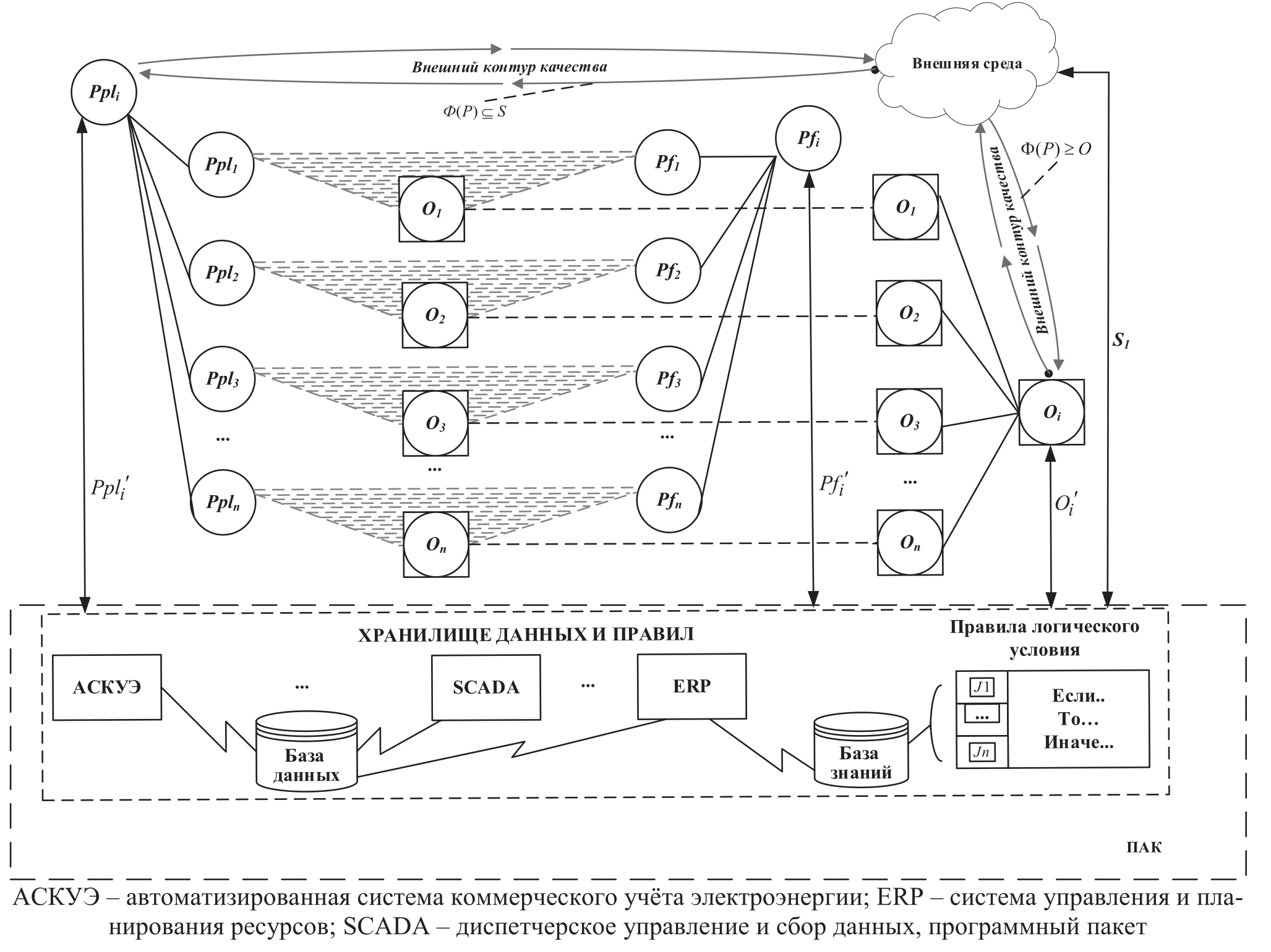 В системе электроснабжения на предприятии электроэнергетики на основе нормативной документации формируются Ppli – плановые показатели/индикаторы и нормы качества ЭЭ. – множество показателей зависит от конкретного объекта электроснабжения и категории потребителей. Пусть Ф(P) – функция, характеризующая нормативные показатели/индикаторы и нормы качества ЭЭ, поступающие из внешней среды S. Показатели и нормы качества ЭЭ должны соответствовать нормативной документации (регламенты, положения и др.) отображает учёт внешней среды при формировании нормативной документации.