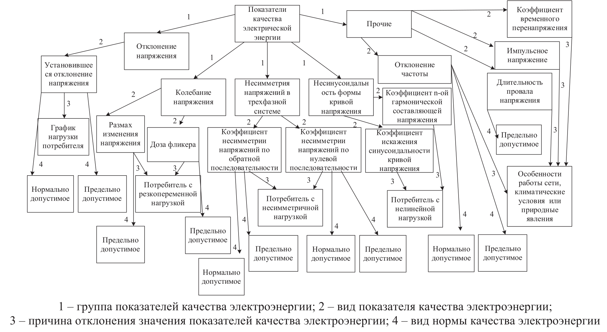 1 – группа показателей качества электроэнергии; 2 – вид показателя качества электроэнергии; 3 – причина отклонения значения показателей качества электроэнергии; 4 – вид нормы качества электроэнергии