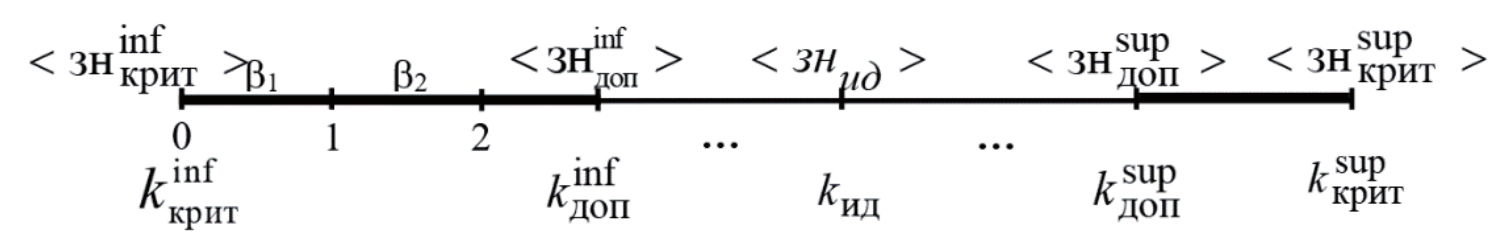 В результате выполнения такой процедуры шкала значений ресурса примет вид, показанный на рисунке 1, где целыми числами обозначены порядковые номера значений слева направо, символами k с подстрочными и надстрочными знаками - функционально-значимые точки шкалы значений, а символами b с индексами - степени опасности переходов между опасными значениями переменной.