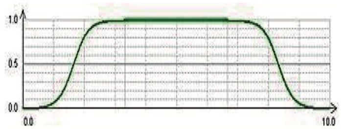 Свойство нелинейности востребовано также применительно к немонотонным ОцФ, каковыми являются функции принадлежности классу. Линейные фронты трапеции (рисунок 2), моделирующие меру отклонения значения показателя от границы нормы (класса), применяются в отсутствие информации об отношении ЛПР к этим отклонениям. Поскольку фронты трапеции являются монотонными функциями, к ним применимы типы функций, изложенные выше, а именно, парабола, обратная парабола и логистическая функция. На рисунках 7-9 изображены функции принадлежности классу с соответствующими фронтами.