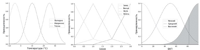 Функции принадлежности для сезонных параметров заданы в виде гауссовских кривых, определяемых параметрами среднего значения (среднее) и стандартного отклонения (σ). Поскольку данные функции асимптотически стремятся к нулю, дополнительно вводятся ограниченные интервалы, в пределах которых рассматривается их ненулевая часть.