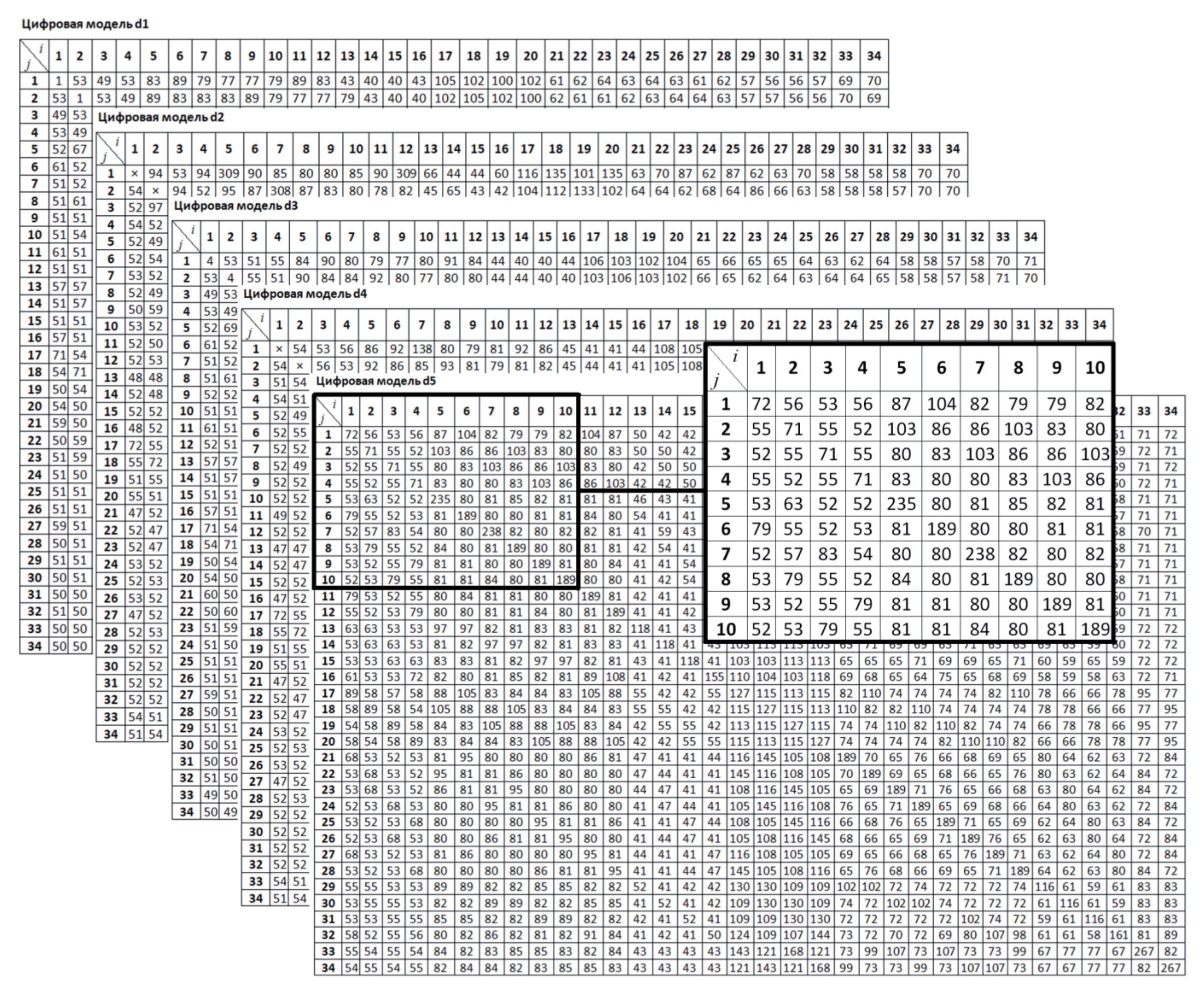 Каждый столбец в таблице соответствует i-му структурному элементу модельной конструкции, каждая строка – разрушению j-го структурного элемента. Каждая ячейка таблицы содержит значение эквивалентного напряжения σij: например, для ЦМ d5 в процессе разрушения третьего структурного элемента (j = 3) во втором структурном элементе (i = 2) максимальные эквивалентные напряжения составляют σ23 = 55 МПа.