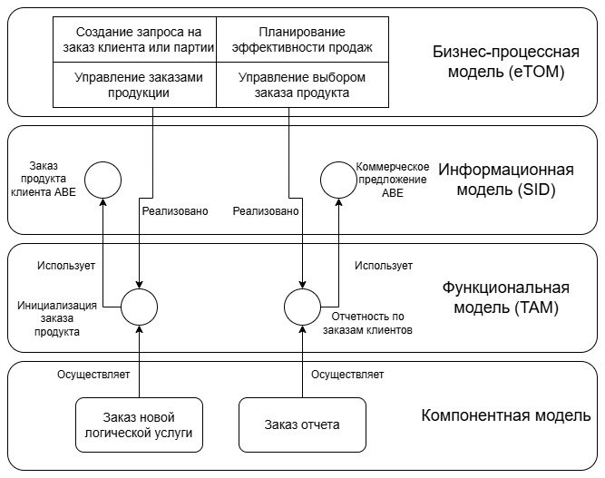 В [8] представлен ГЗ, построенный на основе стандартизированных для области телекоммуникаций моделей, разработкой и поддержкой которых занимается консорциум TM Forum, специализирующийся на стандартизации и управлении телекоммуникационными и цифровыми сервисами. TM Forum предоставляет фреймворк (TM Framework, TMFF), включающий в себя бизнес-процессную (Enhanced Telecom Operations Map, eTOM), информационную (Shared Information and Data Model, SID), функциональную модели (Functional model) и модель приложений (Telecom Application Map, TAM). Модель TMFF и связи между её элементами на примере задачи заказа услуг показаны на рисунке 1.
