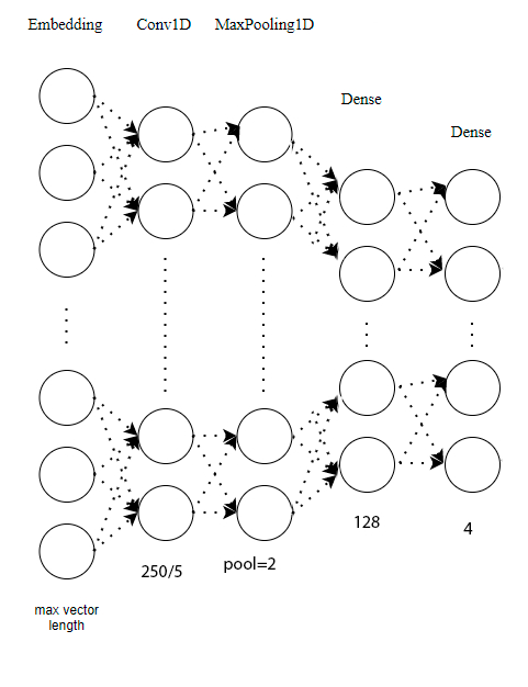 - Слой Conv1D – свёрточный слой, необходим для глубокого обучения. С данным слоем точность классификации текстовых сообщений повышается. Функция активации – «relu».