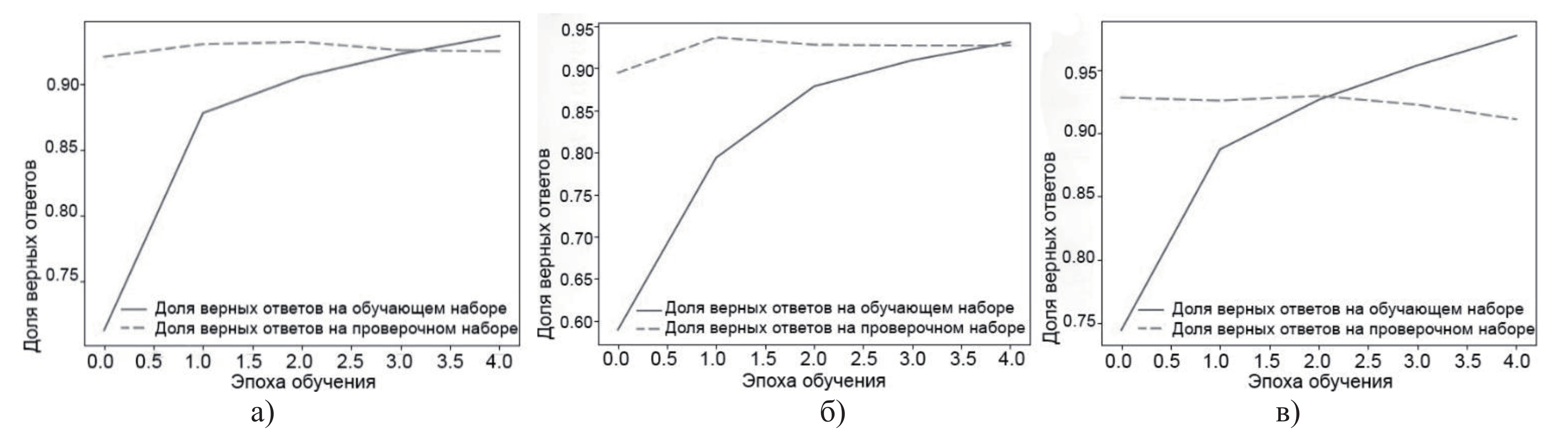 Соотношение обучающей и тестовой выборок для всех применяемых алгоритмов составило 80/20. Графики, отражающие результаты классификации на обучающем и тестовом наборах данных для LSTM-, GRU- и CNN-архитектурах, представлены на рисунке 5.