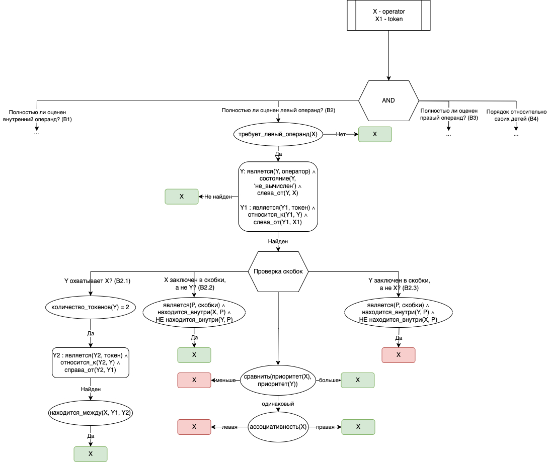 Для построения рассматриваемой ветви дерева необходимо определить порядок действий, чтобы ответить на вопрос: может ли в данный момент на текущем шаге вычислен выбранный оператор? Пусть X1 - токен, который выбран на текущем шаге решения задачи, X - оператор, который соответствует выбранному токену. Если выбранный оператор требует вычисления левого операнда, то в исходном выражении необходимо найти конкурирующий оператор Y - не вычисленный слева от X оператор, удовлетворяющий условию Y : является(Y, оператор) ∧ состояние(Y, ‘не_вычислен’) ∧ слева_от(Y, X), и соответствующий ему слева от X1 токен Y1 : является(Y1, токен) ∧ относится_к(Y1, Y) ∧ слева_от(Y1, X1). Далее возможны четыре ситуации: либо Y охватывает X (B2.1), либо X находится в скобках, в которых нет Y (B2.2), либо, наоборот, Y в скобках, в которых нет X (B2.3), либо скобок вовсе нет (B2.4). Если для первых двух ситуаций (B2.1, B2.2) ответ положительный, то X может быть вычислен на текущем шаге решения задачи; в третьей ситуации (B2.3) положительный ответ означает, что X вычислен быть не может; в четвёртой ситуации (B2.4) решение принимается на основе приоритетов X и Y, а в случае одинаковых приоритетов - на основе ассоциативности X. Рассмотренная ветвь решения показана на рисунке 4.