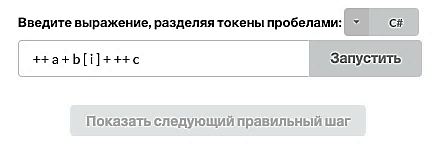 Пример использования подсказки показан на рисунке 7 - в данном случае операция «+» справа ещё не должна выполниться, потому что операция «+» является левоассоциативной. Ситуация до выбора подсказки имеет два правильных варианта следующего шага: операция «+» в позиции 3 и операция «++» в позиции 9.