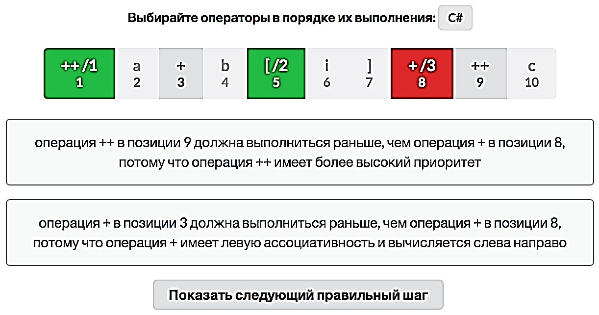 Для каждой ошибки ИТ генерирует сообщение на основе шаблона с позициями всех соответствующих операторов (см. рисунок 6). Ошибки с номерами 4 и 5 являются похожими с точки зрения формальной модели ПрО, но для большинства начинающих программистов такое определение является слишком сложным, поэтому сообщения об ошибках для них выводятся разными. На рисунке 6 первая и вторая выбранные операции (операция «++» в позиции 1 и квадратная скобка в позиции 5) оказались правильными, но затем ошибочно выбрана операция «+» в позиции 8. Два оставшихся оператора должны быть вычислены до неё по разным причинам: операция «++» в позиции 9 должна быть вычислена ранее, потому что её приоритет выше чем у «+», а операция «+» в позиции 3 должна быть вычислена перед операцией «+» в позиции 8, потому что операция «+» является левоассоциативной. ИТ показывает обучаемому все причины, чтобы он мог проанализировать свою ошибку.