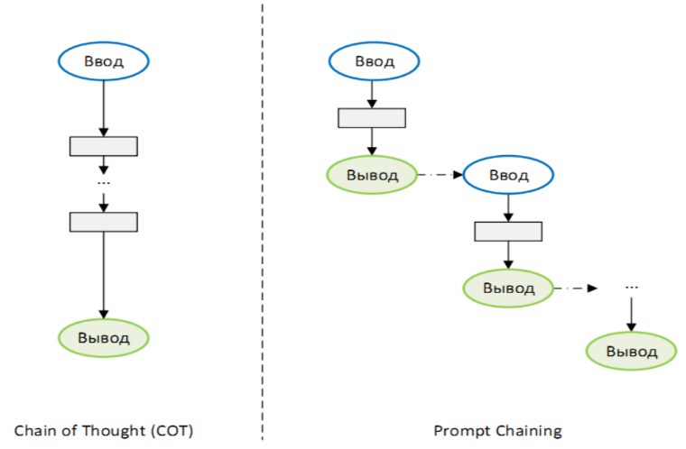 Одной из стратегий для решения сложной задачи является её декомпозиция на более простые и разработка для каждой из подзадач собственного решения. Применительно к БЯМ такой подход называется цепочка инструкций, когда для каждого этапа создаётся отдельная инструкция и результаты предыдущих этапов могут использоваться для генерации инструкции следующего этапа. Цепочка инструкций подразумевает использование выходных данных одной модели в качестве входных данных для следующей модели и, по сути, включает несколько подсказок (см. рисунок 1 справа). Метод цепочки рассуждений использует одну, более длинную инструкцию, которая описывает пошаговый процесс рассуждений для получения ответа.