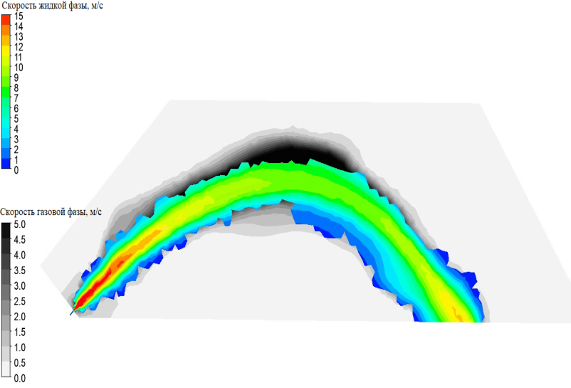 На рисунке 6 изображены поля скоростей жидкой и газовой фаз в сечении вертикальной плоскостью симметрии выходного патрубка, полученные по результатам численного расчёта на основе k-ε и VOF с использованием модели с параметрами, соответствующими проведённым натурным испытаниям.
