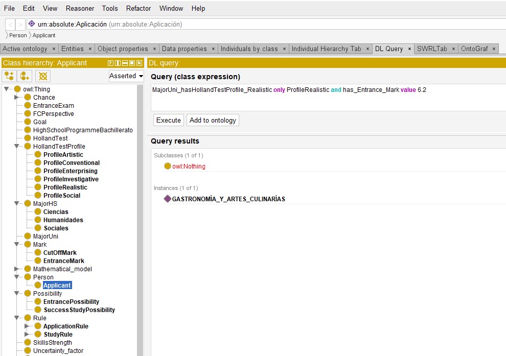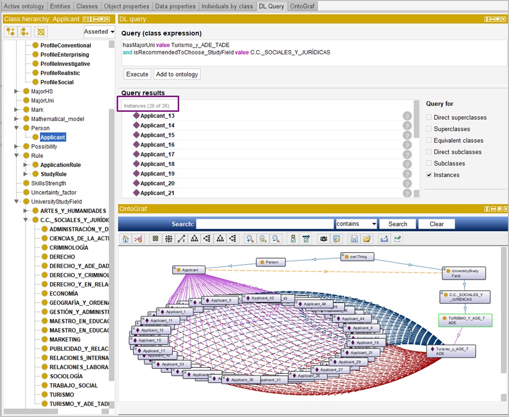 Данные опрошенных первокурсников были введены в онтологию как экземпляры класса Applicant. Экземпляр класса – это прецедент, принадлежащий классу. В результате созданы 50 экземпляров класса Applicant с данными студентов, которые прошли тестирование и выбрали специальность TADE. Используя режим Query DL к разработанной онтологии, можно формировать группы студентов с одинаковыми значениями психологических профилей и соответствующими рекомендованными направлениями обучения. Одна из таких групп была сформирована в результате выполнения запроса к БЗ: «Кому из студентов, обучающихся на специальности TADE, она была рекомендована при поступлении?». На рисунке 3 приведён пример этого запроса (Query), в котором фигурирует университетская специальность (MajorUni) и рекомендованное направление обучения в университете (RecommendedToChoose_StudyField): hasMajorUni value Turismo_v_ADE_TADE and isRecommendedToChoose_StudyField value C.C._SOCIALES_Y_JURIDICAS.