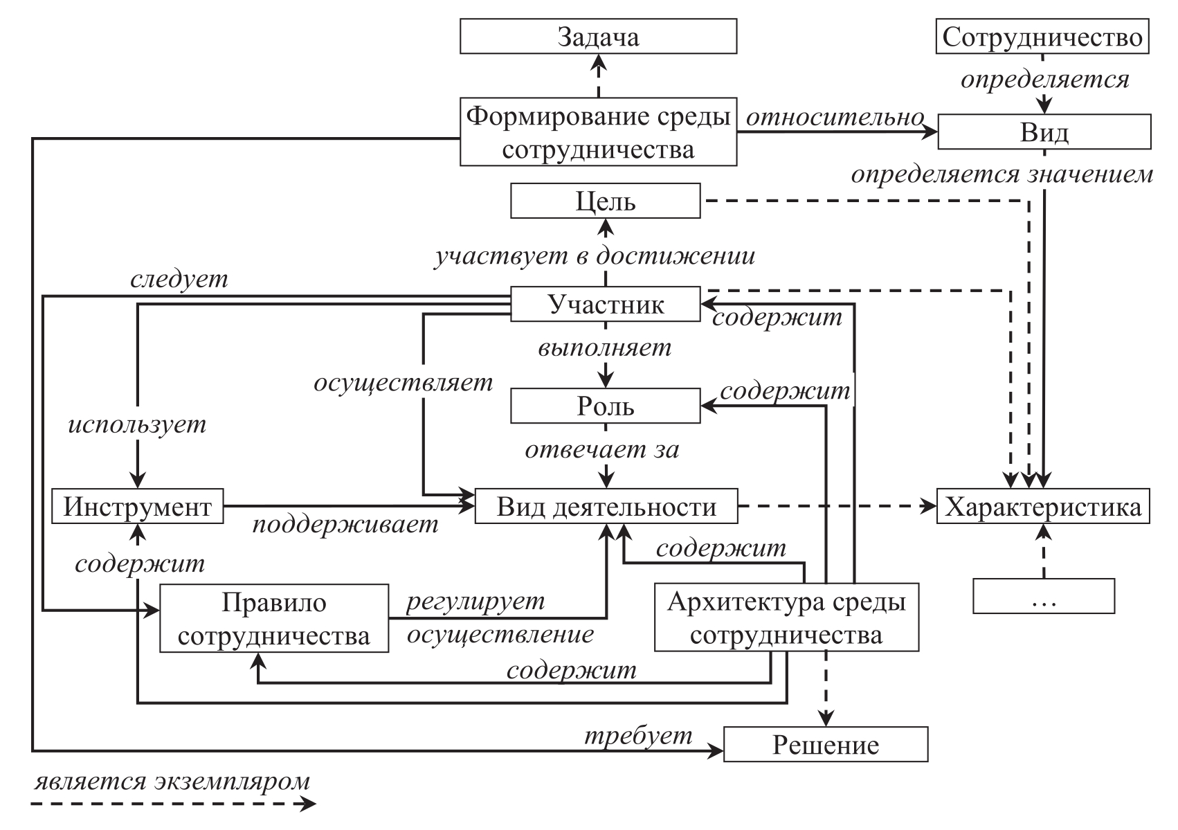 Организационные паттерны описывают решение проблемы в терминах характеристик сотрудничества [11], компонентов и принципов среды сотрудничества [12]. Данные паттерны определяют процесс сотрудничества как выполнение деятельности в соответствии с принципами и структурой среды сотрудничества. Паттерны предоставляют решение для задачи формирования среды сотрудничества. Предлагаемое паттернами решение – архитектура среды сотрудничества. КМ организационного паттерна представлена на рисунке 1. Для концептов, которые не определены в разделе 1.1, в модели использованы следующие определения.