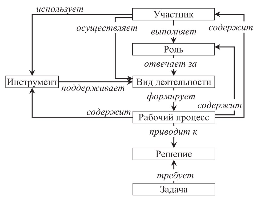 Согласно модели процесса участники сотрудничества осуществляют деятельность, выполнение которой приводит к решению некоторой задачи. ВД, которые составляют общую деятельность по решению задачи, формируют рабочий процесс. Он специфицирует последовательность выполнения ВД, роли, участников и инструменты. Участники действуют в соответствии с ролями, которые они выполняют, и, при необходимости, используют инструменты, поддерживающие определенные ВД.