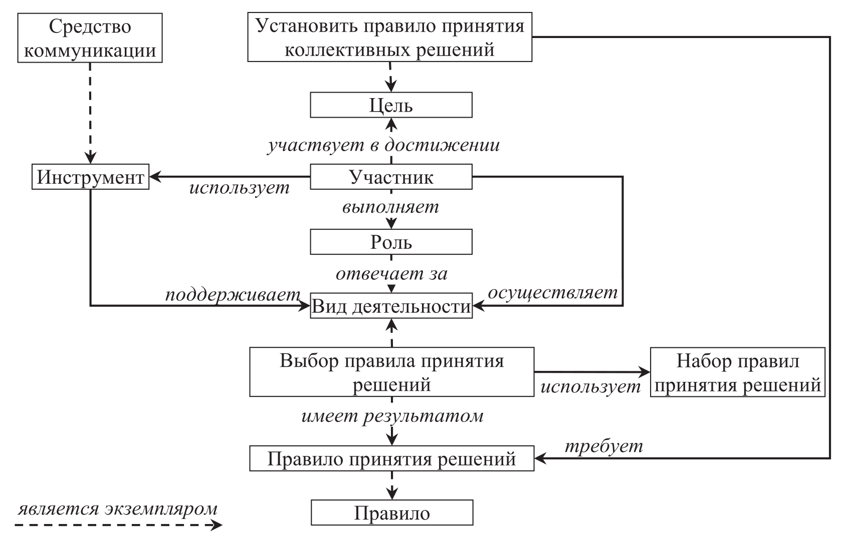 Паттерны совместной инженерии описывают решение проблемы в терминах правил принятия решений участниками сотрудничества [17, 24]. Данные паттерны определяют процесс сотрудничества как процесс принятия решений. Паттерны предлагают решение для задачи установки правил коллективного принятия решений. Предлагаемое паттернами решение – процедура выбора и согласования участниками сотрудничества правил принятия коллективных решений. КМ паттерна совместной инженерии представлена на рисунке 5. В ней определены нижеприведённые концепты.