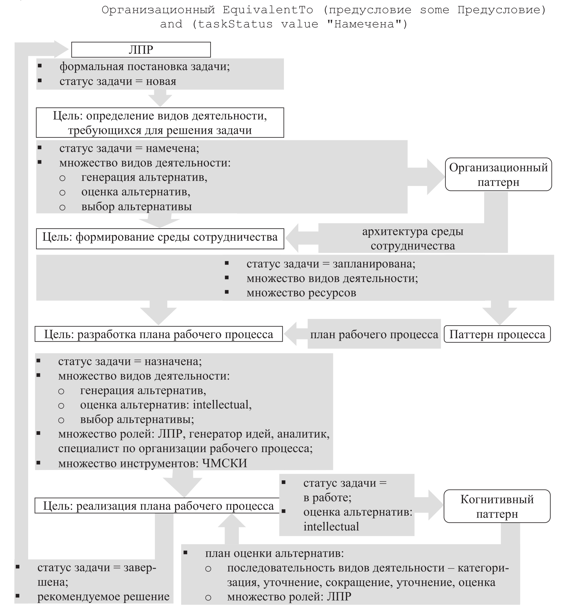 Паттерны процесса [13, 14, 22, 23] описывают решение проблемы в терминах ВД и рабочих задач, которые участники сотрудничества должны предпринять или выполнить, чтобы прийти к этому решению, а также инструментов, которые они могут использовать. Эти паттерны ориентированы на сотрудничество, под которым понимается выполнение участниками действий, ведущих к решению задачи или достижению цели. Паттерны предлагают решение для проблемы планирования процесса сотрудничества. Предлагаемое паттернами решение – спецификация рабочего процесса решения задачи или достижения цели.