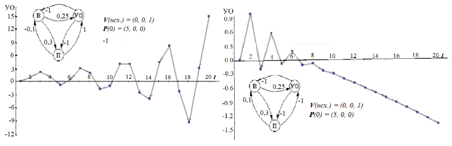 В качестве примеров на рисунке 4 приведены графики развития неустойчивых импульсных процессов относительно вершины УО в орграфе D2 с разными знаками весов дуг (П, В) и (П, УО). На графиках значения соседних импульсов соединяются линиями только из соображений наглядности.