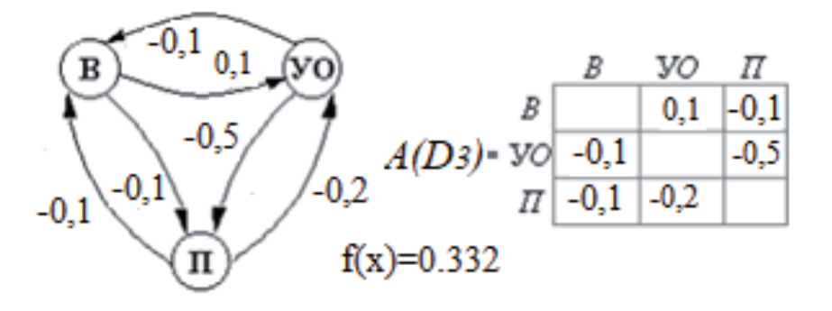В качестве примера можно рассмотреть трёхзвенную модель процесса АО в виде знакового орграфа D1 и его матрицы смежности А(D1) (рисунок 1), где в качестве вершин орграфа представлены следующие переменные: