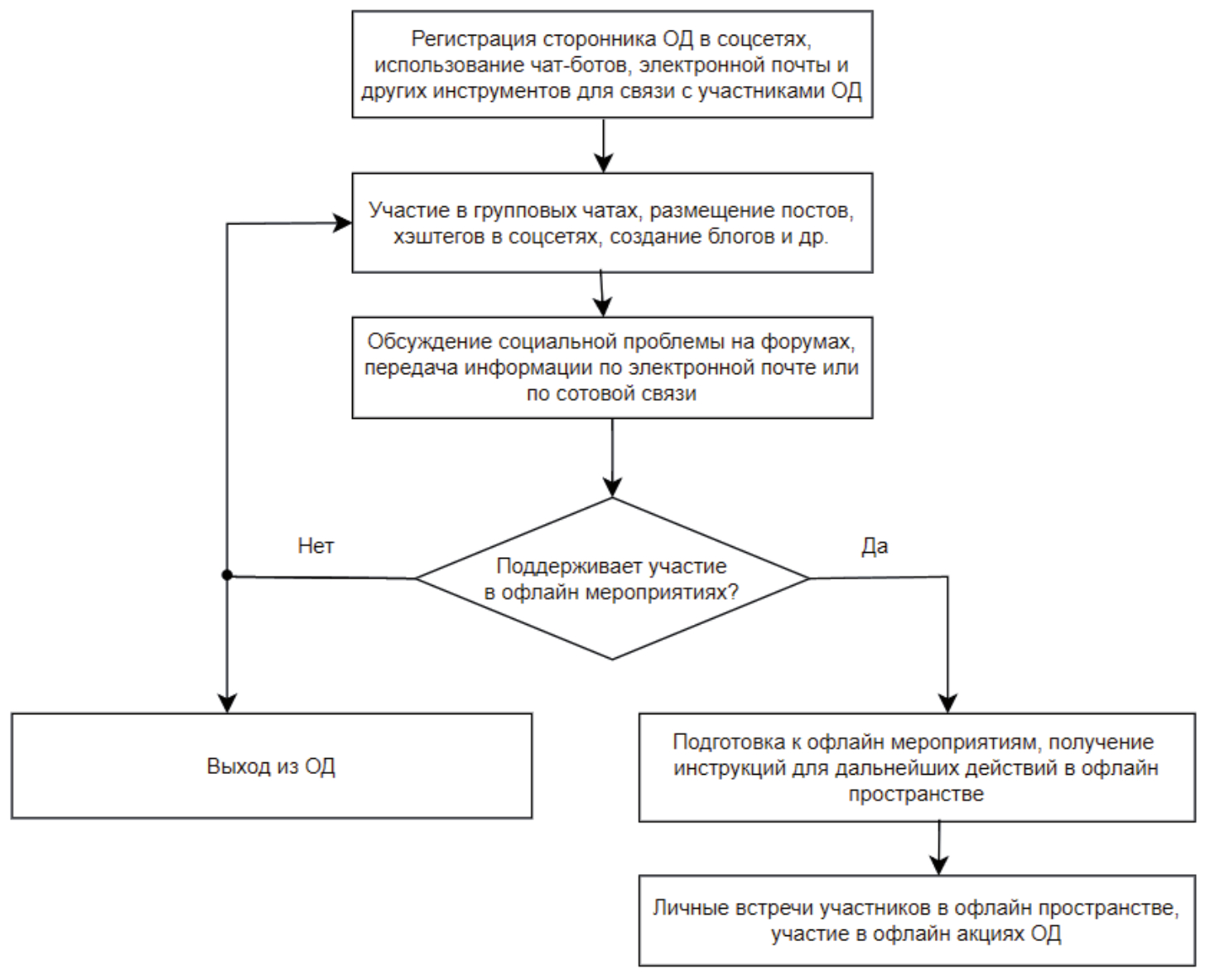В цифровом обществе структуры, которые создаются участниками ОД в онлайн-пространстве, являются модифицированными социальными структурами. Участники регистрируются на платформах, называют своё имя, предпочтения, включаются в группы по интересам. Заявление о себе на веб-сайте – это тип отношений, который превращает пользователей в участников ОД [8]. В условиях современного ИД изменился принцип структуризации ОД. На основе цифровых технологий сформировалась схема деятельности участников ОД с новым содержанием (см. рисунок 2).
