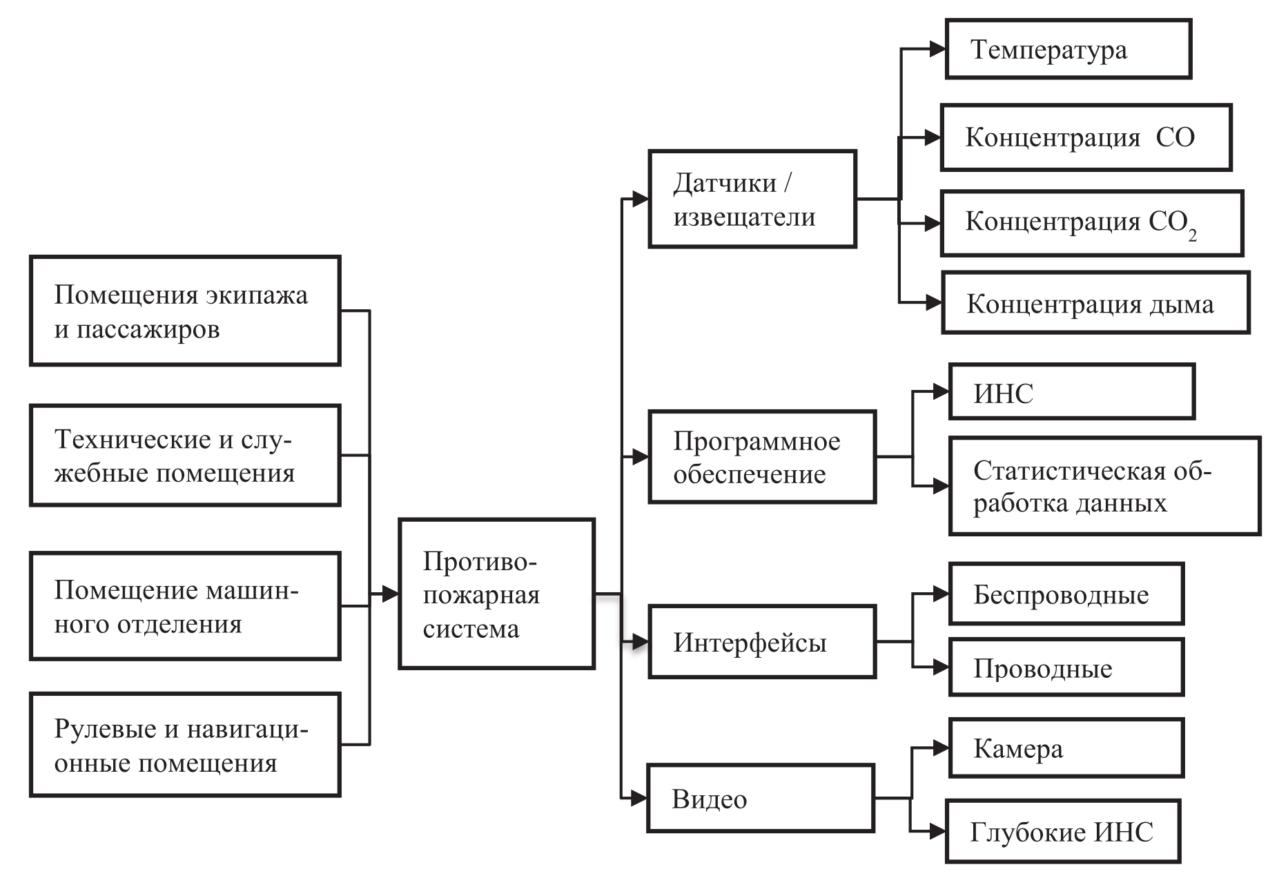 ПС содержит датчики основных факторов пожара, в частности температуры, видимости, концентрации газов и дыма. Система видеонаблюдения выполняет функцию обнаружения возгорания в поле видимости. При фиксированном расположении датчиков их связь с центральным вычислительным блоком может быть проводной. При изменении условий возможного возникновения пожара в помещениях судна (размещение горючих материалов, выполнение ремонтных работ и др.) целесообразно использовать беспроводный интерфейс, позволяющий размещать датчики в новое, адекватное ситуации, положение. Укрупнённая онтологическая модель ПС показана на рисунке 1.