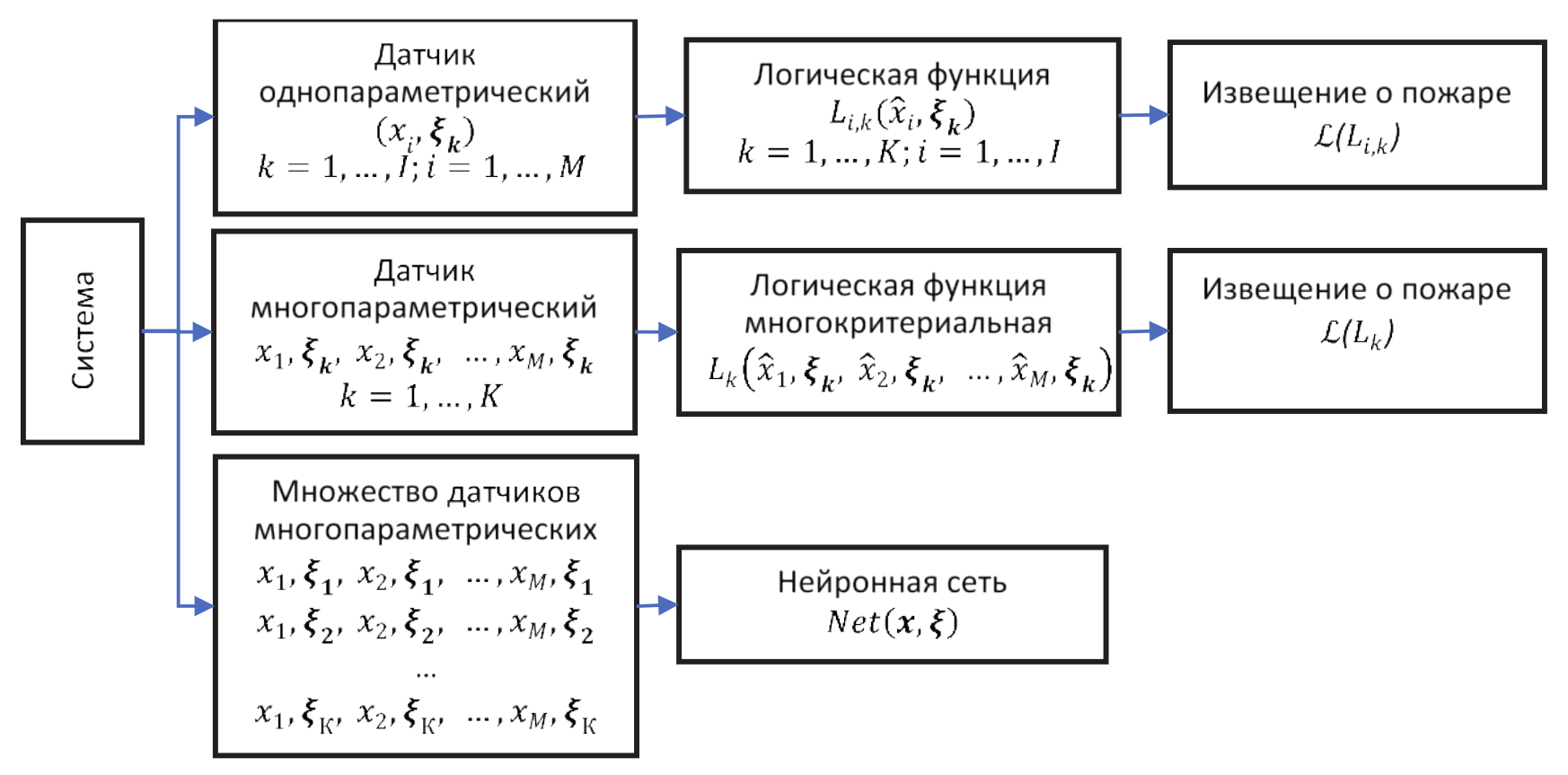 Датчик однопараметрический - конструктивно обособленное устройство, которое содержит первичный измерительный преобразователь для выработки сигнала xi,i = 1…I измерительной информации. В ПС используются I однопараметрических датчиков в координатах ξk, k = 1,…K [5]. Многопараметрический датчик имеет несколько измерительных преобразователей x1, ξk, x2, ξk, … xм, ξk, для выработки нескольких сигналов измерительной информации. Некоторые пожарные извещатели, в зависимости от конструкции, могут являться датчиками, передающими измеренные показания. Извещатели, в отличие от датчиков, не являются средствами измерения, поскольку применяют к результатам измерения пороговую обработку для получения логических значений и применения к ним логической функции . Однопараметрические пожарные извещатели выполняют измерение фактора пожара, последующую пороговую обработку фактора и/или его производной и формируют логический сигнал (Li,k) по уровню опасного фактора и/или его производной.