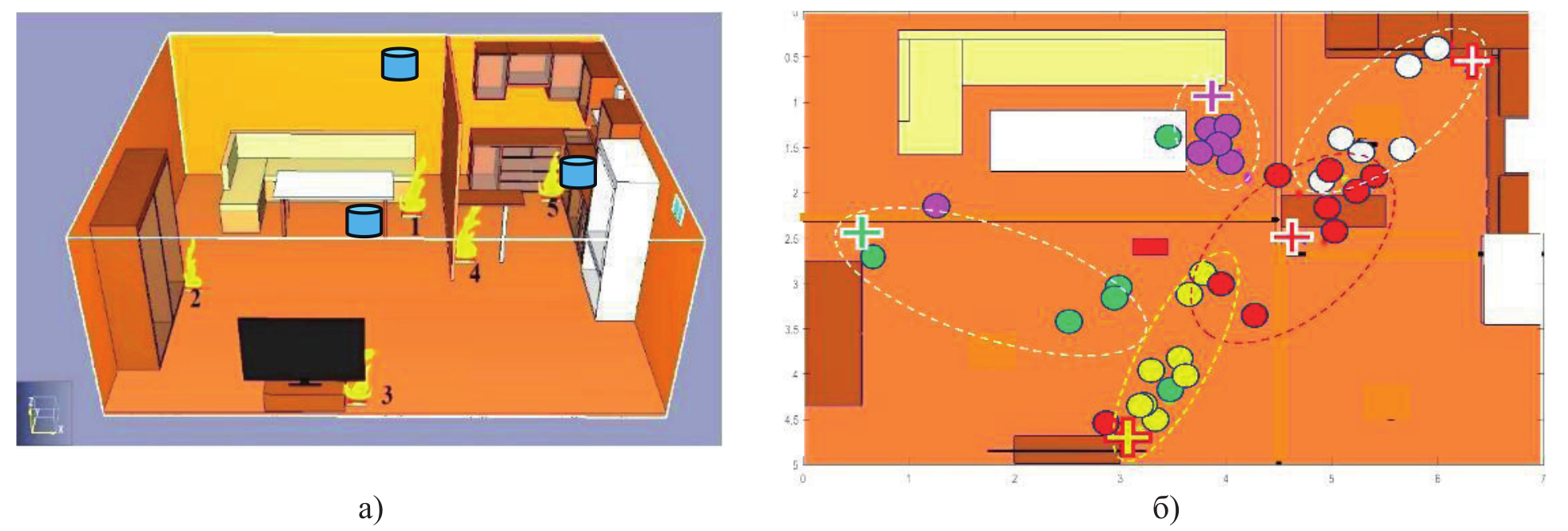 Рисунок 7 – Результаты локализации очагов возгорания в помещении судна: а) помещение судна с обозначенными очагами пожара и многопараметрическими датчиками; б) проекция помещения с указанием очагов возгорания (крестики) и результатами их локализации (пунктирные овалы)