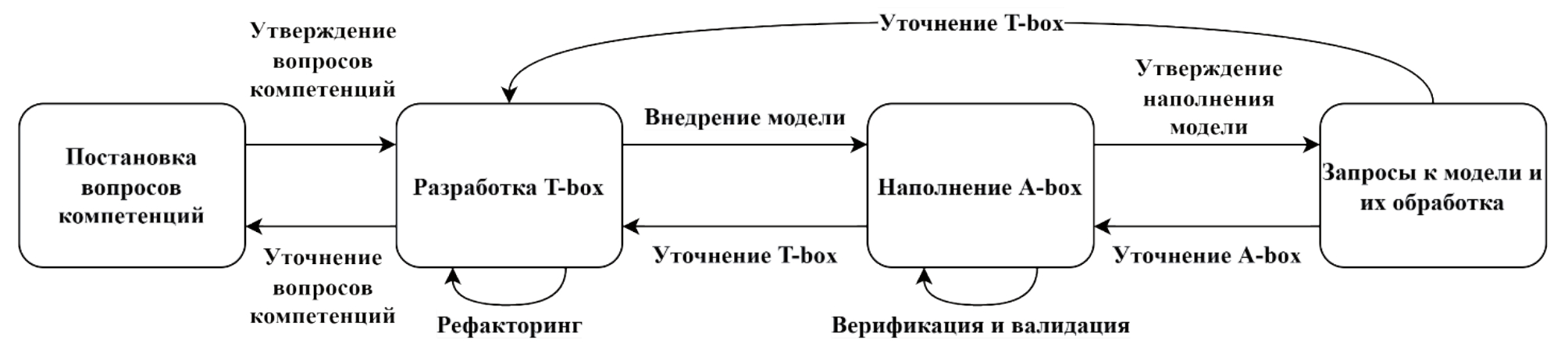 ЖЦ ОР можно представить как последовательность операций по постановке вопросов компетенций, разработке, утверждению, рефакторингу и уточнению T-box и A-box модели, запросов к ОМ. Схема ЖЦ ОР представлена на рисунке 1.