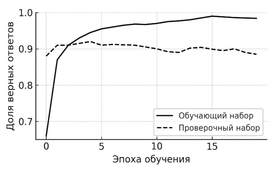 В результате эксперимента с целью сравнения качества работы НС с максимальным полученным значением доли верных ответов на проверочном НД (рекуррентной НС на основе GRU с идентичными параметрами) и выбора наиболее эффективной НС установлено, что доля правильных ответов на обучающем НД возрастает (рисунок 3). Полученные результаты показали, что на обучающем НД доля правильных ответов для этой модели составила 96%. На проверочном НД доля правильных ответов достигла 92%, что указывает на способность модели правильно классифицировать данные, которые не использовались для обучения.