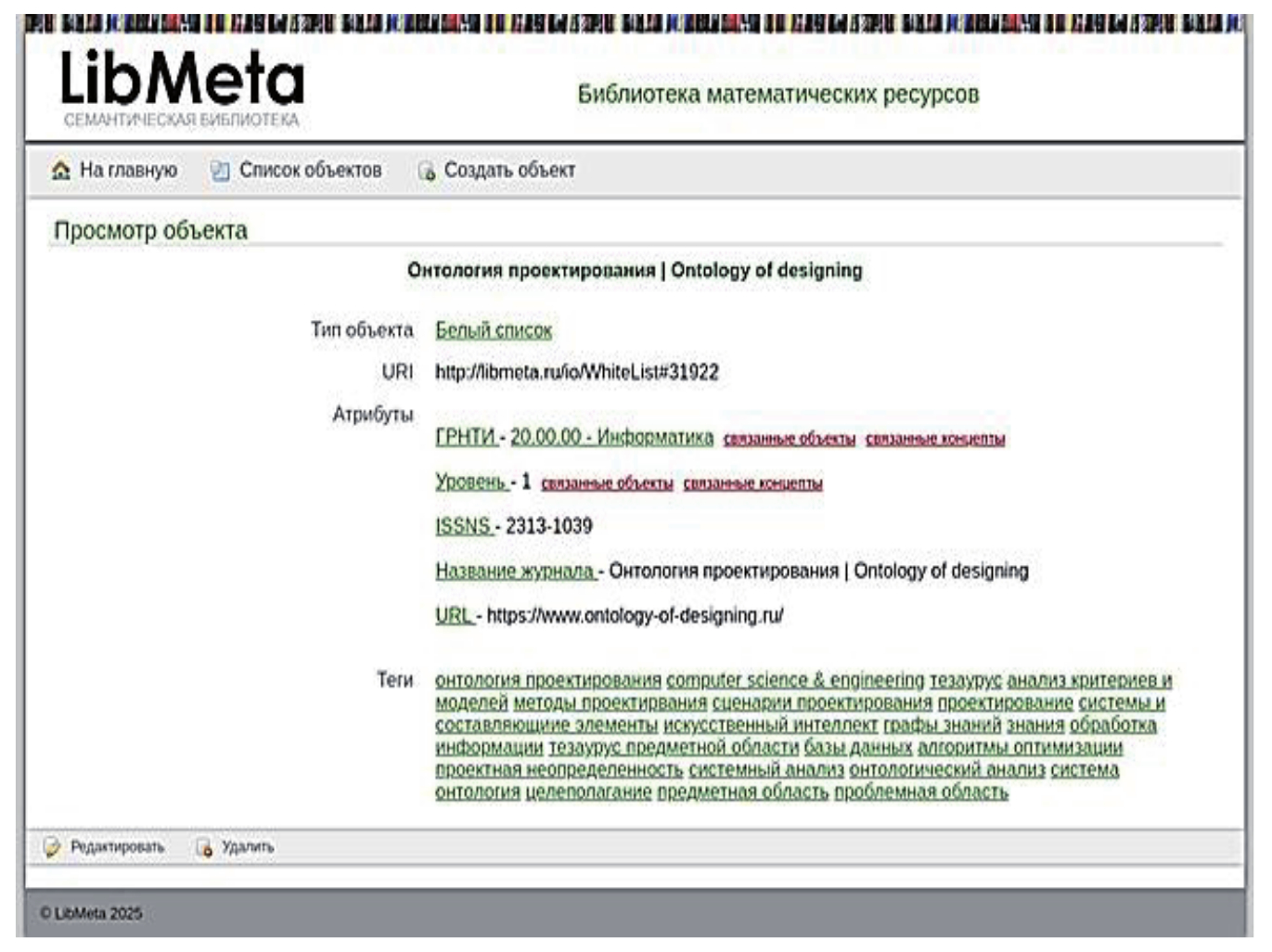 На рисунке 5 представлен пример сведений о журнале из БС, загруженном в библиотеку SciLibRu, с установленными семантическими связями, которые были выявлены в процессе семантического анализа.