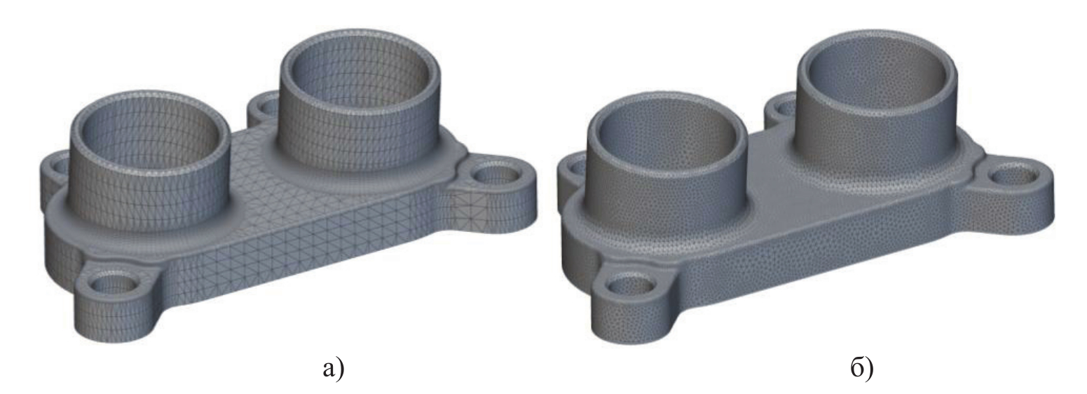 Рисунок 2 – а) сетка трёхмерной модели детали; б) перестроенная конечно-элементная сетка