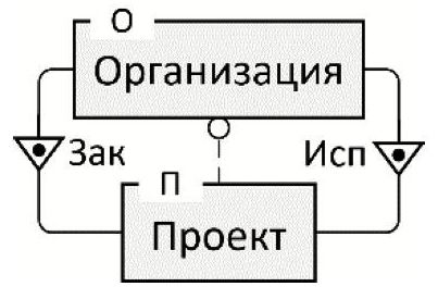 Простейший случай подобных отношений может возникать в моделях, содержащих два класса сущностей с двумя связями между ними (см., например, рисунок 1). Здесь класс Организация задаёт множество экземпляров – конкретных организаций, а класс Проект – множество конкретных проектов. Две связи типа «один-ко-многим» – Зак (заказывает) и Исп (исполняет) – задают отношения «предок-потомок» между сущностями. Конкретная организация может быть заказчиком и исполнителем нескольких проектов, но каждый проект имеет одну организацию-заказчика и одну организацию-исполнителя. Пусть при этом имеет место ограничение: одна и та же организация не может быть одновременно заказчиком и исполнителем одного и того же проекта. Данное ограничение никак не отражается традиционными средствами в рассматриваемой модели, т.е. ничто не препятствует, чтобы некоторый экземпляр Проекта ссылался на один и тот же экземпляр Организации и как на заказчика, и как на исполнителя. Налицо «нарушение целостности» – аномалия, потенциально допускающая несогласованность и требующая введения дополнительных семантических пояснений к ER-модели. Это обстоятельство отражено на схеме с помощью пунктирной линии, концевой кружок которой задаёт направление от класса-предка к классу-потомку. Это ограничение целостности можно назвать МП-ограничением, которое может возникать в ER-моделях, имеющих следующие структурные особенности (МП-отношения):
