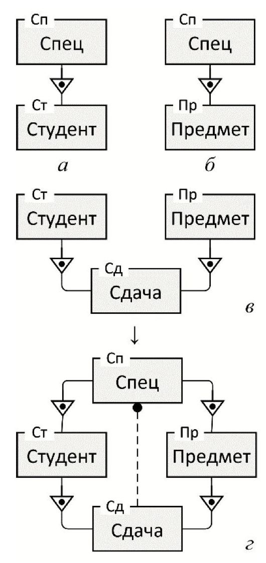 На рисунке 2 эта ситуация иллюстрируется на простом примере. Здесь локальная модель «а» задаёт отношение «один-ко‑многим» между сущностями Спец (специальность) и Студент: на каждой конкретной специальности может обучаться несколько студентов, но каждый конкретный студент обучается на одной специальности. Аналогичным образом локальная модель «б» утверждает: каждая специальность может включать несколько предметов, но каждый предмет относится к одной специальности. Локальная модель «в» задаёт отношение «многие-ко-многим» между сущностями Студент и Предмет с помощью сущности-пересечения Сдача: каждый конкретный студент может сдать несколько конкретных предметов, а каждый конкретный предмет может быть сдан несколькими конкретными студентами. Экземпляр сущности Сдача соответствует паре «конкретный студент – конкретный предмет». Модель «г» на рисунке 2 представляет собой композицию моделей «а», «б» и «в», содержащую все отношения между сущностями Спец, Студент, Предмет, Сдача.