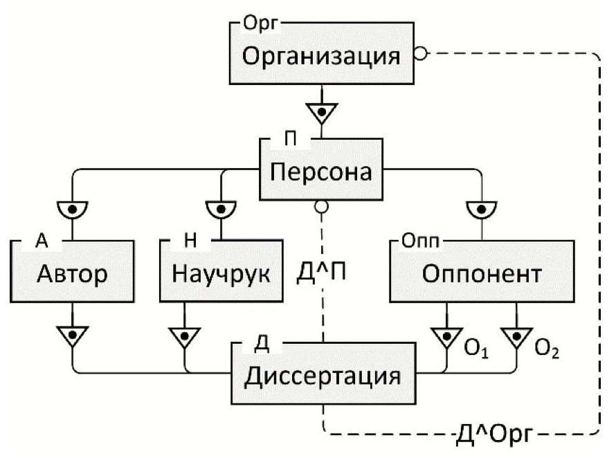 На рисунке 7 представлен более сложный пример, содержащий два взаимосвязанных ограничения отрицательной МП-целостности. В отличие от модели на рисунке 6 здесь дополнительно присутствует Оппонент, как класс Персоны, а также сущность Организация, как предок Персоны. У диссертации должно быть два оппонента, что обеспечивается связями О1 и О2. Каждая Организация может содержать насколько аффилиированных Персон, каждая Персона должна быть аффилирована с одной Организацией.