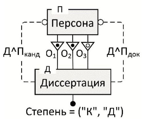 На рисунке 8 представлен пример ER-модели, отражающей участие персон в качестве оппонентов диссертации, для чего класс Персона связан с классом Диссертация тремя связями – О1, О2, О3. Отрицательная МП-целостность Д^П (не показана на рисунке) призвана обеспечить требование: оппоненты одной диссертации должны быть разными персонами. При этом (в отличие от примера на рисунке 7) учитывается, что для кандидатской диссертации требуется два оппонента, а для докторской – три. Для этого связь О3 «третий оппонент» допускает сирот (светлый кружок). Вид конкретной диссертации («кандидатская» или «докторская») задаётся значением атрибута Степень.