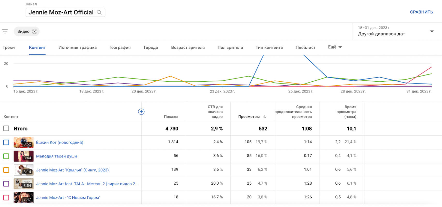 Финальный этап аудита результатов эксперимента имеет два сценария: синхронный и диахронический. Синхронный сценарий аудита результатов эксперимента представляет собой еженедельный сбор статистики прослушиваний композиций артистов на стриминг-сервисах Apple Music и VK Music параллельно с анализом данных за соответствующий период на YouTube. В контексте экспериментальной части исследования достаточными для выводов будут данные, собранные из «Творческих студий» личных кабинетов артистов на видеохостинге YouTube. Диахронический сценарий аудита представляет собой поквартальное сравнение динамики статистических показателей просмотров нейросетевых клипов к песням артистов на YouTube с данными отчетов о платных стримах, получаемых лейблом Media Sharks раз в три месяца в соответствии со сроками налогово-отчетных периодов от дистрибьютора — Believe Digital. В настоящий момент ввиду доступности данных отчета о дистрибьюции за четвертый квартал 2023 г. и прогнозируемости времени доступности отчета о дистрибьюции за первый квартал 2024 г. ближе к началу мая 2024 г. в настоящей статье будут отражены только результаты синхронного аудита.